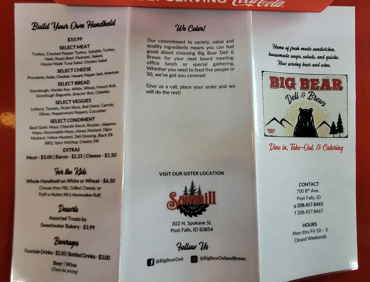 Welcome to Big Bear Deli, nestled in the charming community of Post Falls, Idaho. This delightful eatery has quickly gained a reputation for its mouthwatering sandwiches and exceptional service. With a menu that boasts an array of hot and toasted sandwiches like the beloved TBR (Turkey Bacon Ranch) and the classic Reuben, diners are bound to find their favorite. The flavor-forward offerings don't stop there; the handhelds, including the Big Bear and Veggie Wrap, are crafted with fresh ingredients that tantalize your taste buds.